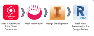 Envision use Cyclone to process the date and generate a mesh model. Inventor to model the new equipment and ReCap Pro for real View presentation of models in the point cloud data.